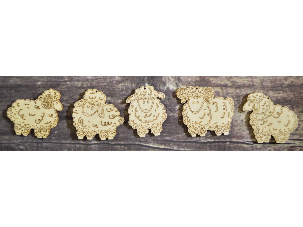 Sada pěti oveček s otvorem pro zavěšení.