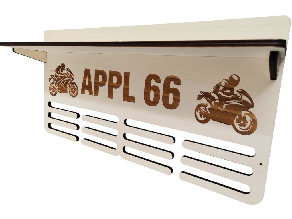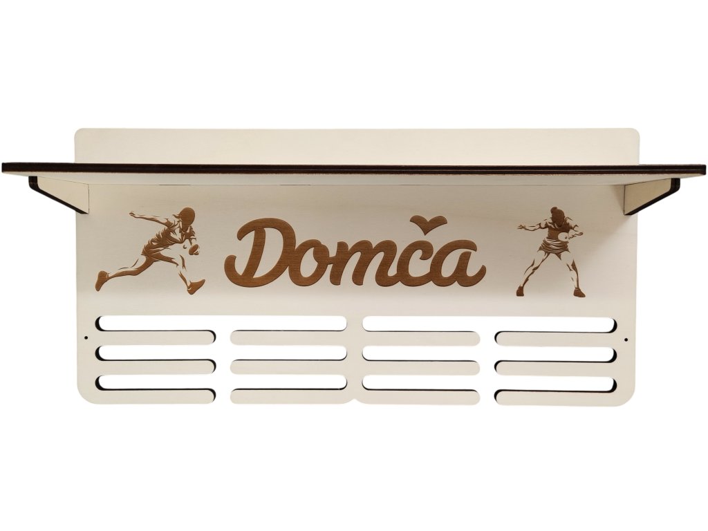 Velký věšák na medaile s vlastním jménem a siuletou sportu je doplněný o poličku, na kterou můžete umístit například poháry. Spodní část obsahuje tři řady nožiček pro zavěšení velkého množství medailí. Montáž může být provedena do zdi na čtyři předpřipravené otvory a součástí balení jsou i podložky aby se snadno medaile zavěšovaly.