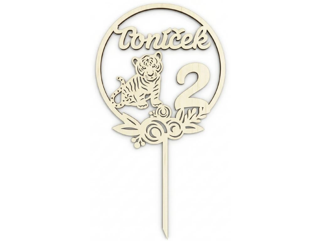 Tato dřevěná ozdoba na dort s motivem roztomilého tygříka je originální a osobní doplněk pro dětské narozeniny. Dekorace je vyřezaná z kvalitního přírodního dřeva a lze ji upravit přesně podle vašich představ – změníme jméno, číslo věku i samotný motiv, pokud si místo tygříka přejete jiné zvířátko či symbol.
