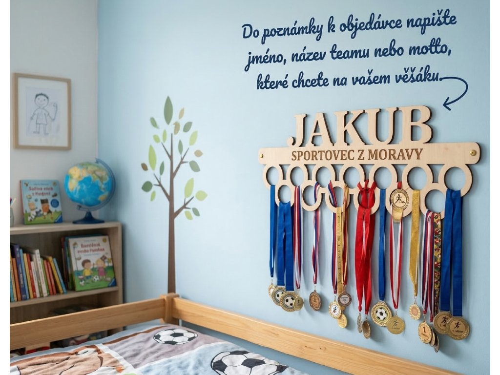 - ✔ Moderní dřevěný držák na medaile s možností doplnění vlastního jména a motivačního motta. Ideální doplněk pro sportovce, který chce své úspěchy vystavit stylově a osobitě.