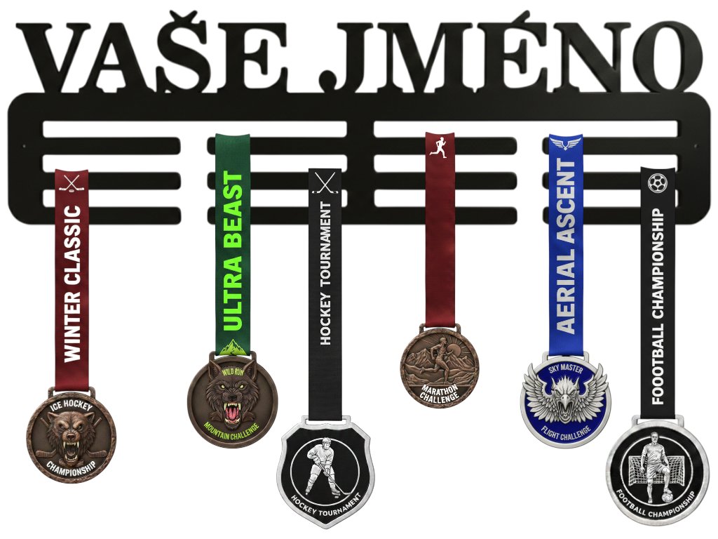 Věšák na medaile – dřevěný, vlastní jméno, tiskací písmo, barva černá